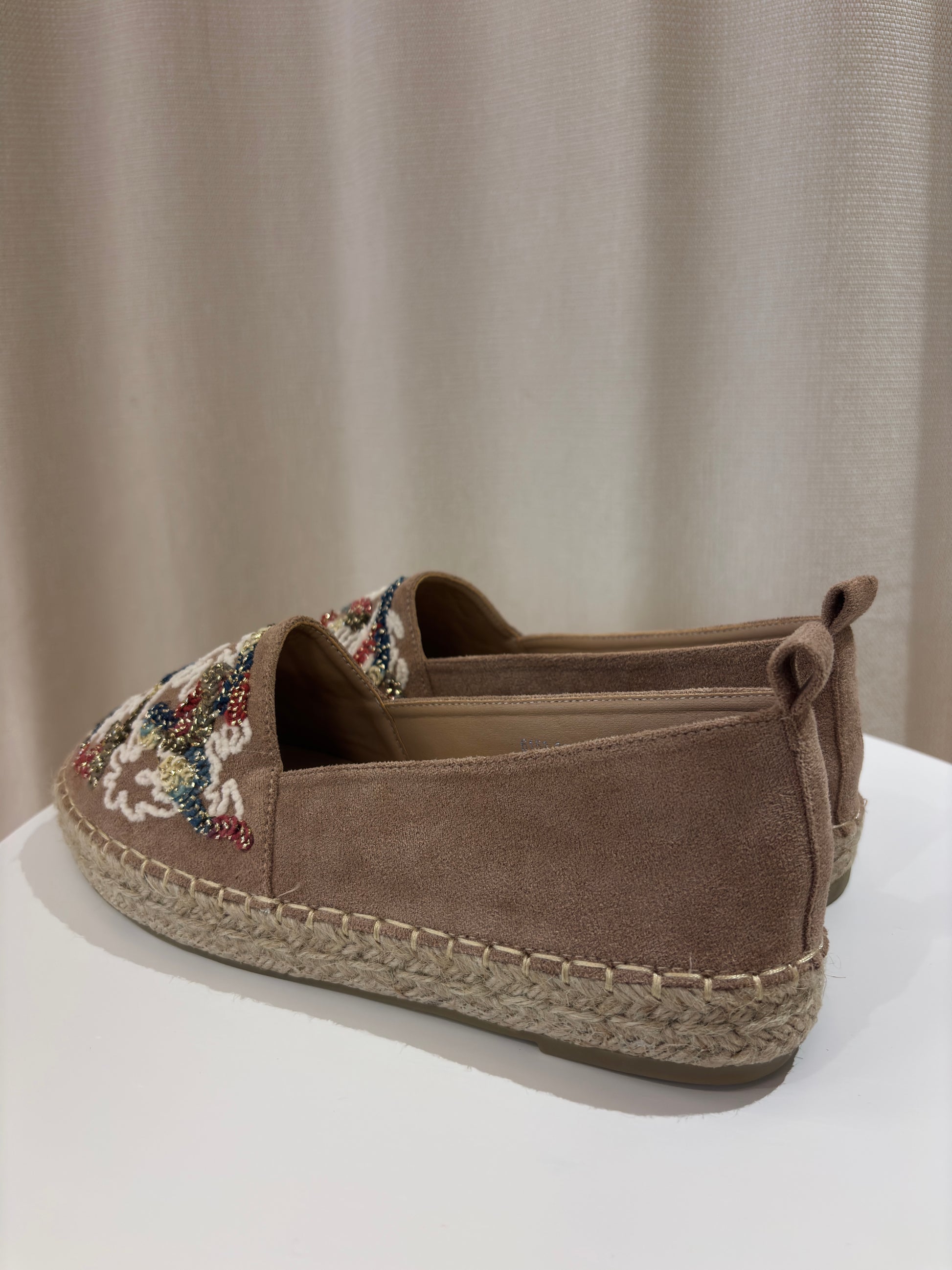 - Taupfarbene Espadrilles mit bunter Stickung