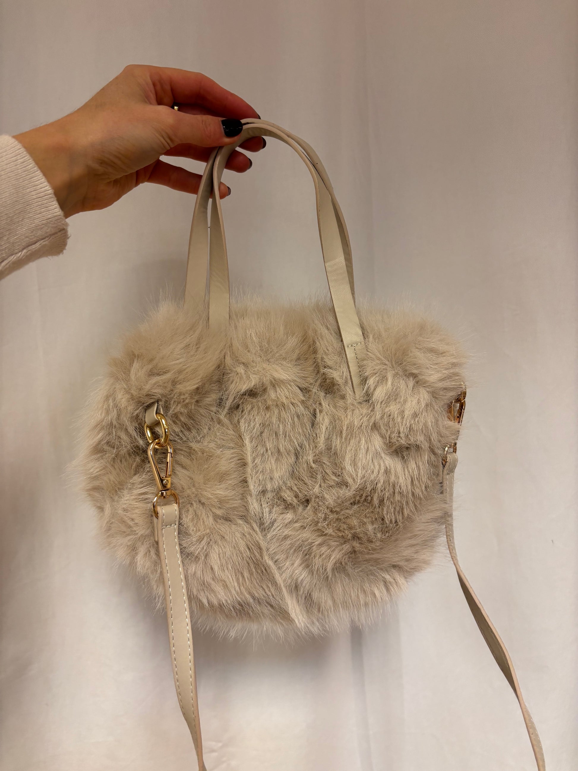- Super süße und stylische Felltasche mit kurzen Henkeln und einem langen zum Umhängen